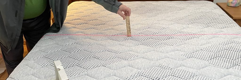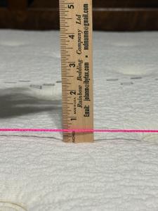 Step 4: Use the wooden ruler upright in the impressions of the mattress. Make sure the string is touching the ruler for an accurate read on how deep the impression is. Make sure the ruler is NOT in a button depression as this will give a false reading. Once placed in the proper position, take two photos where the measurement can clearly be seen.